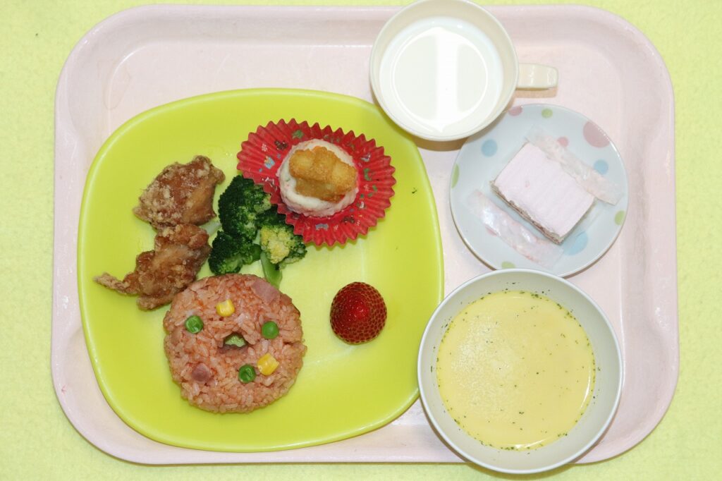ケチャップライス 鶏のから揚げ ポテトサラダゆでブロッコリー コーンクリームスープいちご 星のポテト~おやつ~牛乳 クリスマスケーキ