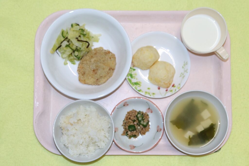 ごはん コロッケ きゃべつの塩昆布和え